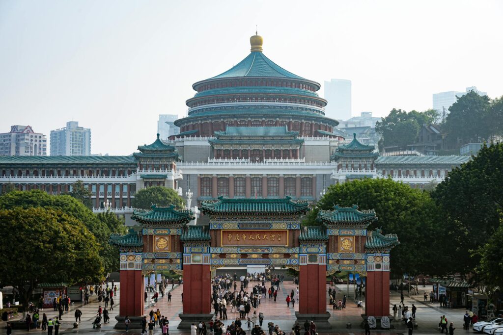 Es el centro político de Chongqing, pero su arquitectura, sus arcos y su plaza son lugares ideales para turistas occidentales.
